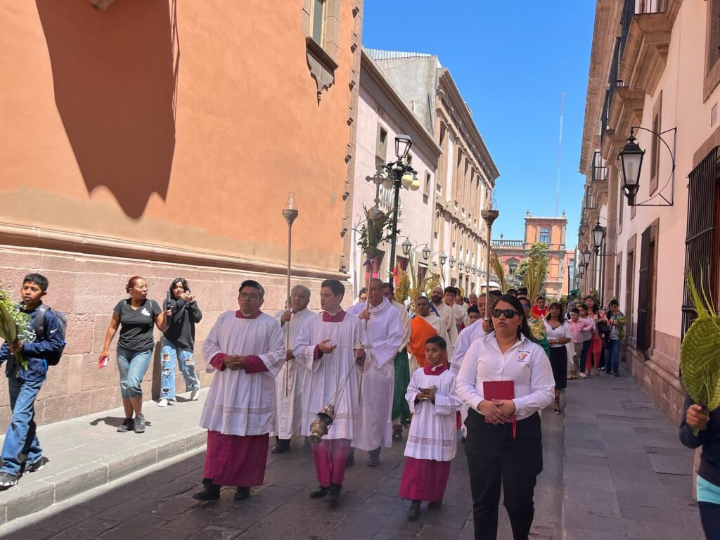 En la mayoría de las iglesias potosinas el Domingo de Ramos se celebra con la bendición y distribución de la palma, que representan las ramas que la multitud esparció frente a Cristo mientrás él entraba en Jerusalén, como se acostumbraba saludar a los reyes.