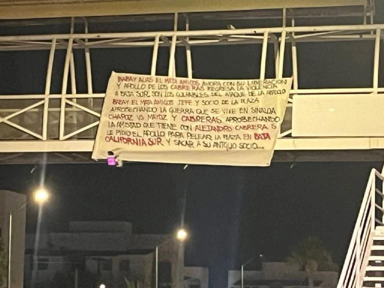 En dos puentes de La Paz fueron colocadas mantas esta mañana de viernes con mensajes de amenazas entre el crimen organizado; los escritos hacen alusión a los hechos ocurridos hace unos días cuando se registraron hechos violentos que dejaron dos heridos con arma de fuego.