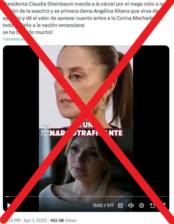 Es falso que la presidenta de México, Claudia Sheinbaum, haya ordenado la detención de la actriz y ex primera dama Angélica Rivera ‘La Gaviota’ por supuestos actos de corrupción durante la presidencia de Enrique Peña Nieto (2012-2018), como afirman usuarios en redes sociales sin presentar evidencia alguna.