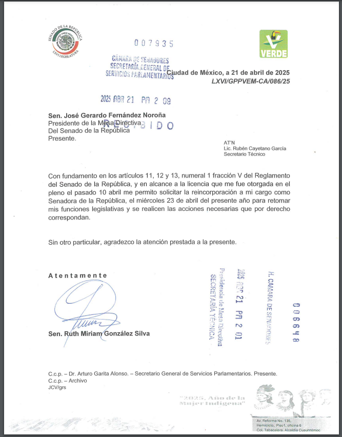 Mediante un documento la senadora notificó al presidente del Senado, Gerardo Fernández Noroña, que se reincorpora este miércoles 23 de abril a su cargo.