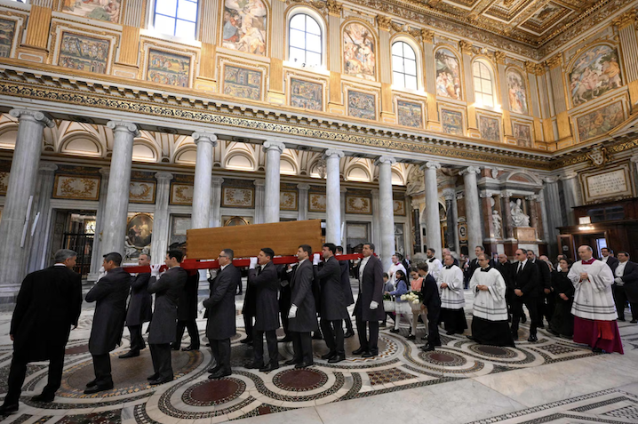 Más de 400.000 personas han asistido al funeral y el cortejo fúnebre del papa Francisco, fallecido el lunes. Tras la homilía, el féretro ha sido trasladado por las calles de Roma desde la plaza de San Pedro hasta la basílica de Santa María la Mayor, lugar que Francisco eligió para su entierro, que se ha celebrado a puerta cerrada, en una ceremonia íntima a la que han asistido sus familiares y el cardenal camarlengo. Delegaciones de 148 países y territorios (incluidos Palestina y Kosovo) con 10 reyes y 10 organismos internacionales han asistido a la ceremonia.