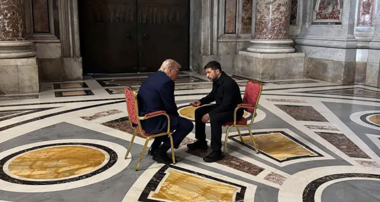 Así se pudo ver minutos antes del funeral del papa Francisco este sábado al presidente de EE. UU., Donald Trump, y a su homólogo ucraniano, Volodymyr Zelensky, al interior de la Basílica de San Pedro.