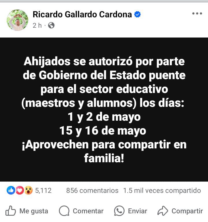 El gobernador del estado, Ricardo Gallardo Cardona anunció dos puentes para el sector educativo, el primero será a inicios del mes de mayo y el segundo a mediados, con el fin de conmemorar el Día del Trabajo y la celebración del Día del Maestro.