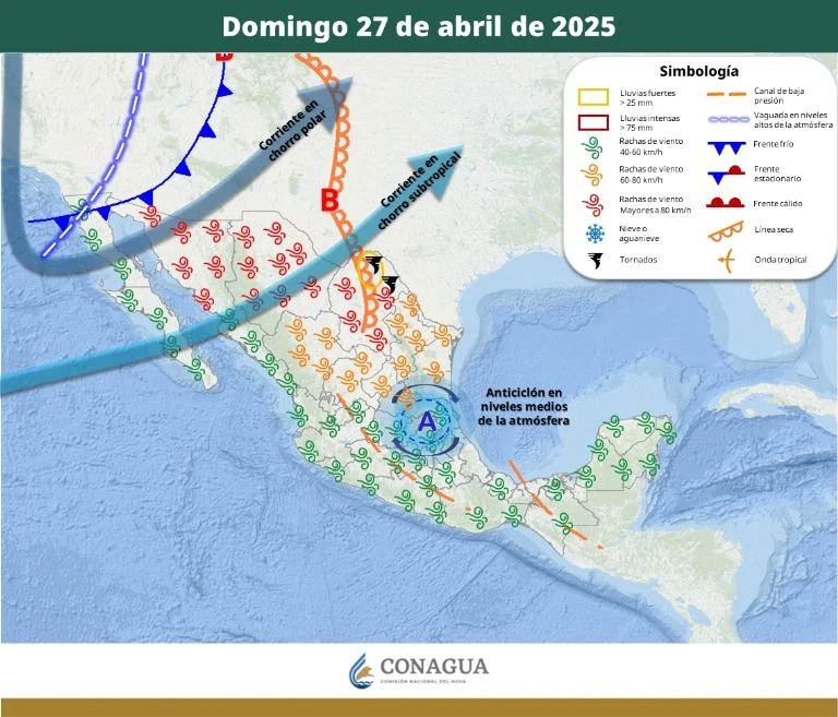 Aunque la ola de calor seguirá con todo para este domingo 27 de abril, donde pegará con hasta 45 grados en el noreste de Chihuahua, el este y sureste de Coahuila, oeste de Durango, Guerrero, sur de Jalisco, Michoacán, Morelos, este de Nuevo León, norte y centro de Sinaloa, Sonora, oeste de Tamaulipas y el sur de Zacatecas.