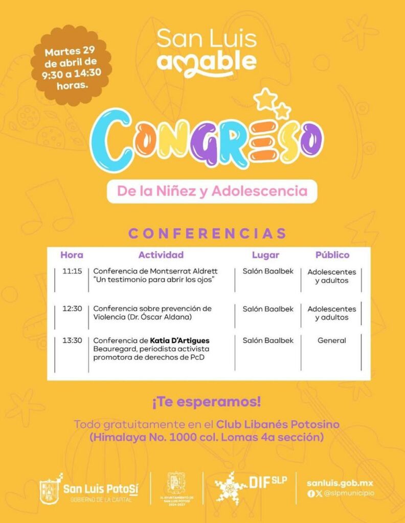 El Sistema Municipal DIF invita a todas las familias a participar en el Congreso de la Niñez y Adolescencia, que se llevará a cabo este martes 29 de abril en el Club Libanés, de 9:00 a 14:30 horas.