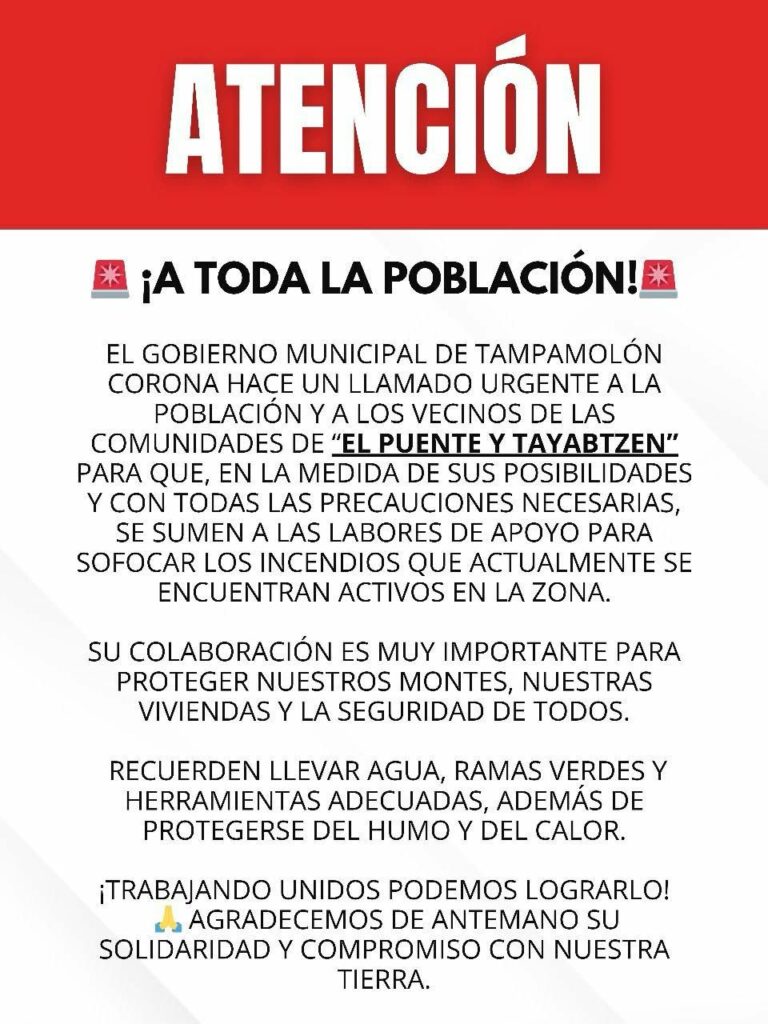 Ante los últimos incendios forestales registrados en el municipio de Tampamolón Corona, autoridades de ese municipio hacen un fuerte llamado a los habitantes de las comunidades de “El Puente y Tayabtzen” para que se sumen a las labores de apoyo para combatir los incendios activos en la zona.