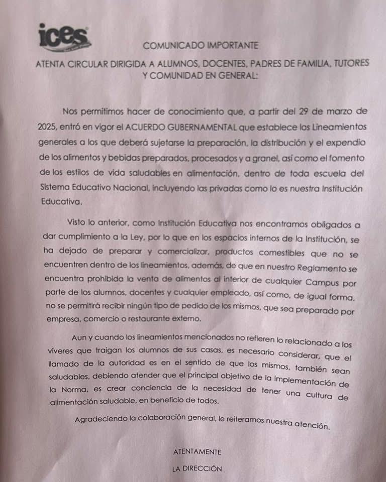 De acuerdo con la versión que circula en redes sociales, alumnos han llegado a ser suspendidos por llevar su propia comida, lo que ha encendido las alarmas sobre el trato que están recibiendo dentro del plantel. La institución alega que está siguiendo indicaciones “nacionales” de la institución; además, ha advertido que se elaborará un reglamento que formalice esta restricción.
