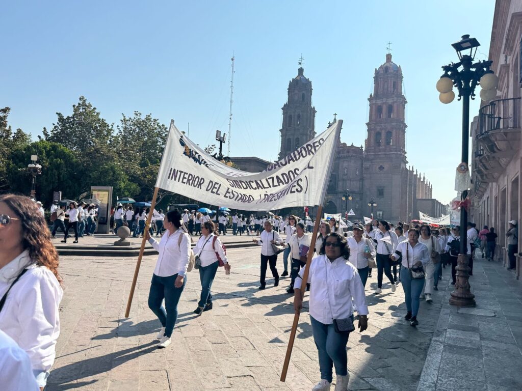 El contingente recorrió las calles del centro histórico de San Luis Potosí demandando el cumplimiento de promesas salariales y adeudos que mantiene el Gobierno del Estado con su gremio.