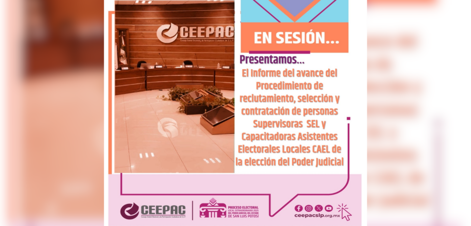 El Consejo Estatal Electoral y de Participación Ciudadana (CEEPAC) presentó el informe de avance del procedimiento de reclutamiento, selección y contratación de personas Supervisoras Electorales Locales (SEL) y Capacitadoras Asistentes Electorales (CAEL) para la elección de personas juzgadoras del Poder Judicial del Estado de San Luis Potosí.