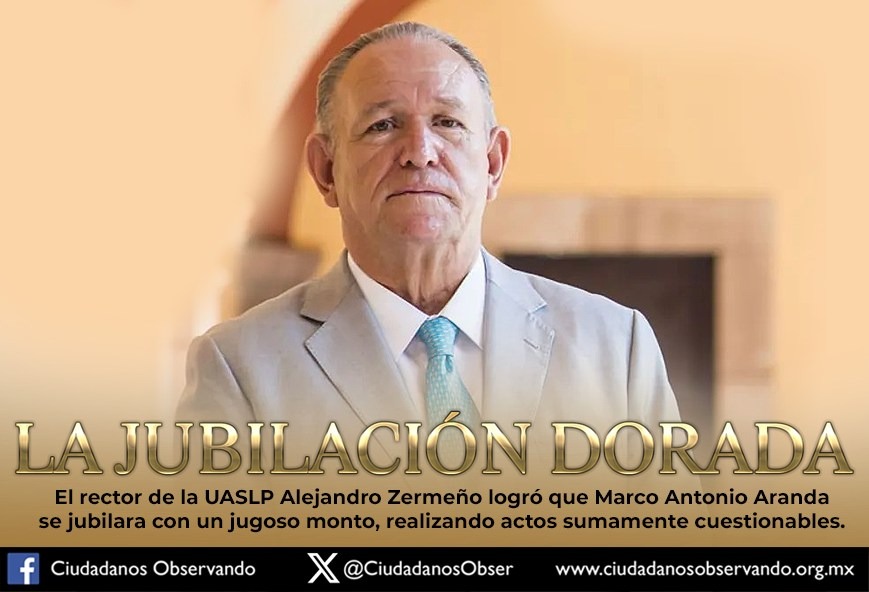 Tras una fugaz y polémica gestión como Secretario General de la Universidad Autónoma de San Luis Potosí (UASLP), Marco Antonio Aranda Martínez fue beneficiado con una jugosa jubilación tras apenas cinco años de servicio efectivo, amparado por una serie de maniobras administrativas que evidencian el uso discrecional de los recursos y reglamentos de la Institución, denunció la organización Ciudadanos Observando.