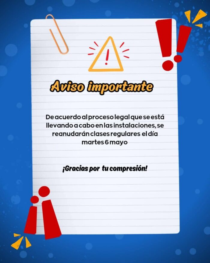 Según el comunicado, dicha póliza ya fue activada y el plantel se hará cargo de los gastos médicos y de recuperación; además, en otro mensaje anunció que las clases se reanudarán el martes 6 de mayo, una vez que concluyan las diligencias legales correspondientes.