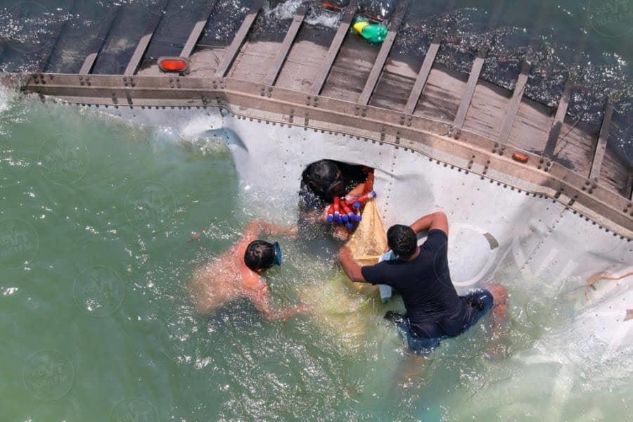 Las imágenes mostradas nos permiten observar que muchos de ellos decidieron colocarse goggles e instrumentos de buceo amateur, para poder introducirse al camión y retirar el producto que éste mantenía en su interior.