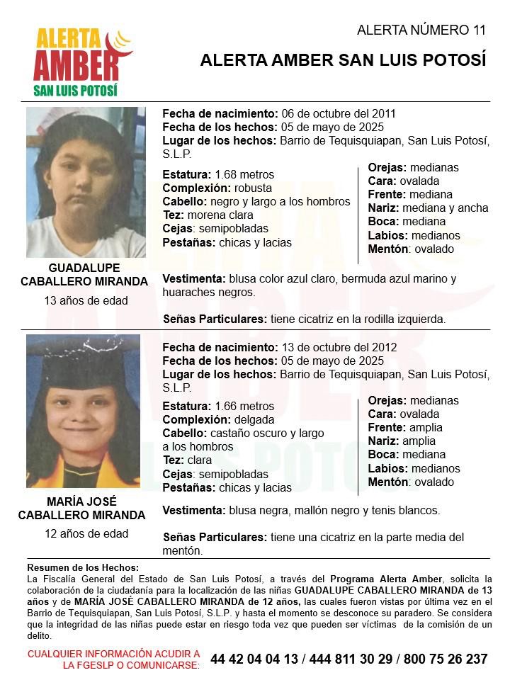 La Fiscalía General del Estado de San Luis Potosí (FGESLP) emite Alerta Amber para localizar a Guadalupe Caballero Miranda y María José Caballero Miranda, quienes tuvieron contacto con sus familiares por última vez el 5 de mayo de 2025, en el Barrio de Tequisquiapan de la Ciudad Capital.