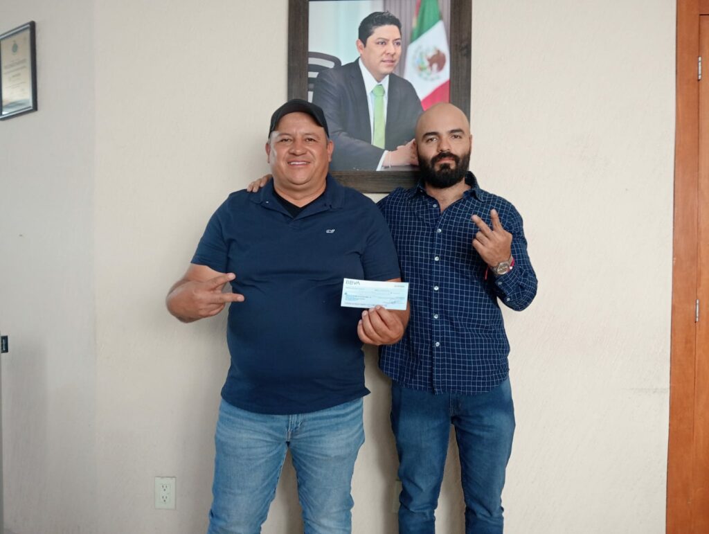 El Director del Instituto Potosino de Cultura Física y Deporte Joaquín García hizo entrega del cheque por la cantidad de un millón de pesos al equipo campeón de la Copa Potosí 2025 Villa de Arriaga GDI recibiendo la cantidad el alcalde de Villa de Arriaga y representante del equipo, Salvador López.