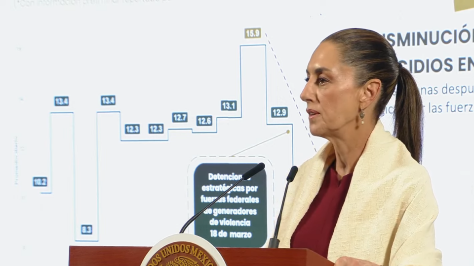 “Se aprecia una tendencia sostenida a la baja particularmente del inicio de la actual administración; el promedio mensual de 65.3 homicidios diarios, si se compara al inicio de la administración en 7 meses se ha tenido una reducción de 24.89% esta disminución entre septiembre de 2024 de 86.9 y abril de 65.3 significa que en abril se registraron 21 homicidios diarios menos”, indicó la funcionaria federal durante la conferencia de prensa de la presidenta Claudia Sheinbaum.