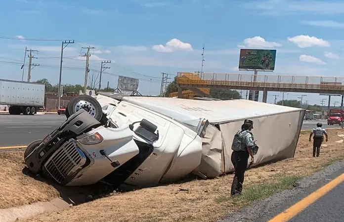 Un tráiler volcó ayer en la carretera a México, a la altura del entronque de Villa de Reyes, resultando solo daños materiales. Se presume que la pérdida del control de la unidad fue la causa del accidente.