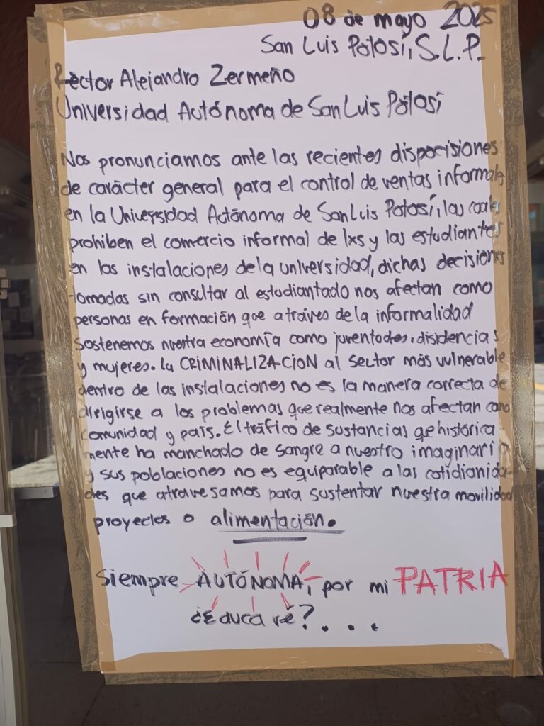 Esto, luego de que estudiantes de la zona oriente colocaron una serie de pancartas en protesta por le nuevo reglamento de la cafetería y, de que, la directora de la Facultad de Ciencias de la Información, Celia Mireles amenazará a una alumna porque traía a la venta pan, advirtiéndole podía sancionarla.