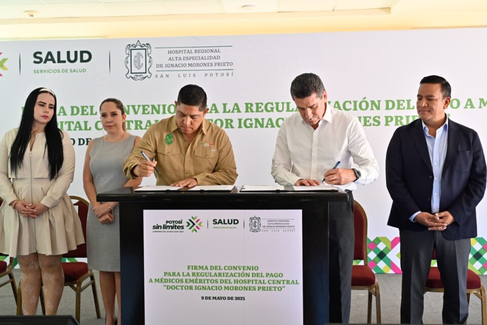 Ricardo Gallardo firmó el convenio para la regularización del pago a médicos eméritos del Hospital Central Doctor Ignacio Moreno Prieto, con lo que se establece formalmente una prestación mensual vitalicia para las y los doctores, quienes durante años brindaron atención a la población.