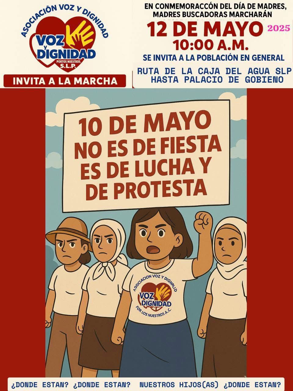 El Colectivo Voz y Dignidad por los Nuestros SLP convoca a la ciudadanía a marchar el próximo lunes 12 de mayo a las 10 de la mañana desde la Caja de Agua hasta Palacio de Gobierno, en la Capital Potosina, para protestar por las y los desaparecidos en San Luis Potosí.