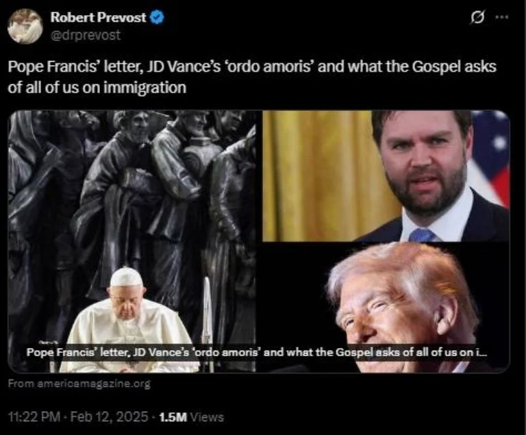 En otra ocasión, el pontífice compartió un artículo de National Catholic, en la que aclaraban al vicepresidente de Estados Unidos, JD Vance, que “Jesús no nos pide que clasifiquemos nuestro amor por los demás”, al hablar sobre temas de migración, lo cual fue considerado como una crítica a declaraciones del funcionario sobre la importancia de preocuparse primero por la propia familia, luego por el prójimo.