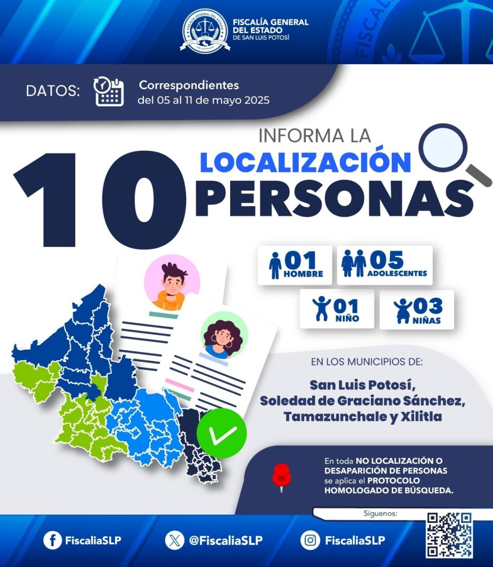 Entre el 5 y 11 de mayo de 2025, la Fiscalía General del Estado de San Luis Potosí (FGESLP) ubicó a 10 personas que habían sido reportadas como no localizadas en el territorio Potosino y de quienes que se habían difundido fichas de búsqueda.