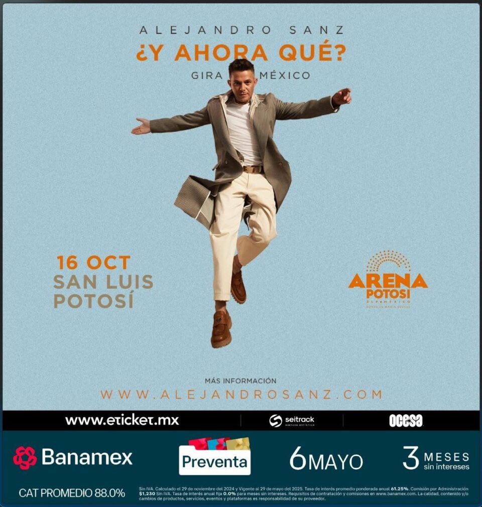 Sanz hará vibrar la Arena Potosí, el próximo 16 de octubre con éxitos como: “Amiga mía”, “corazón partió”, “La tortura” y ¿Y si fuera ella?, entre otros.