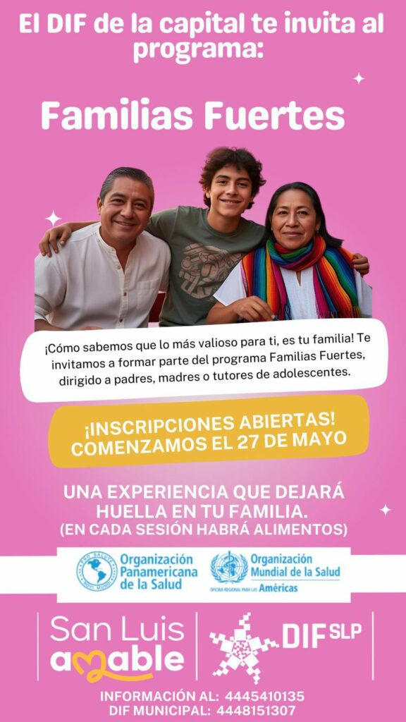 La Presidenta del Sistema Municipal DIF, Estela Arriaga Márquez, invitó a madres, padres y tutores de adolescentes, a participar en el taller “Familias Fuertes”, iniciativa respaldada por la Organización Panamericana de la Salud (OPS), que busca fortalecer los lazos familiares y brindar herramientas efectivas para apoyar el desarrollo emocional y social de sus hijas e hijos.