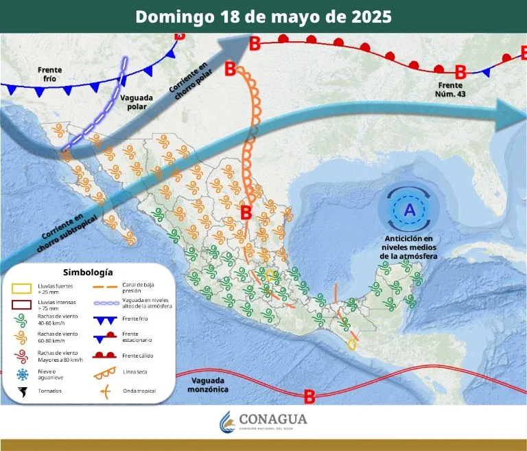 Un nuevo frente frío en interacción con la aproximación de una vaguada polar, así como otros fenómenos, causarán lluvias en 21 estados para el domingo 18 de mayo en el país.