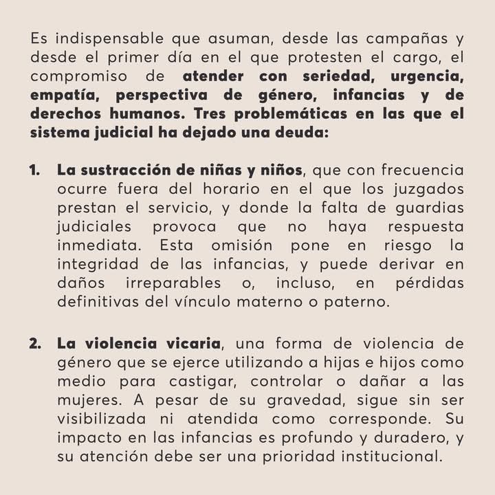 Las y los jueces familiares que resulten electos en la elección extraordinaria del Poder Judicial del Estado, desde el primer día, deben atender con urgencia y con apego a los derechos humanos el tema de la sustracción de menores, la violencia vicaria y los ajustes razonables para personas con discapacidad y en situación de vulnerabilidad, señaló la especialista en derecho familiar, Fátima Viera.