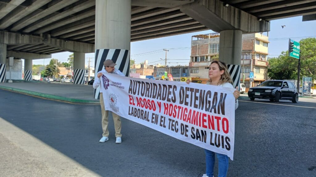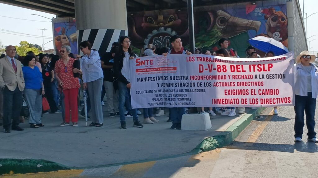 Maestros y alumnos del Instituto Tecnológico de San Luis Potosí (ITSLP), bloquearon la lateral de la Carretera 57 frente a sus instalaciones, para protestar por una serie de abusos en su contra por parte del director José Diego Bárcenas Torres y por la complicidad en actos de corrupción y acoso laboral realizados por su líder sindical, Sergio Sierra.
