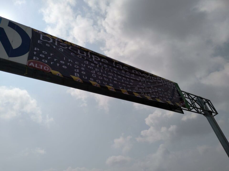 Este jueves, los afectados colocaron una manta en dicha carretera, donde advierten que la carretera será cerrada por incumplimiento de pago a los terrenos donde fue construida y solicitan a los automovilistas buscar vías alternas.