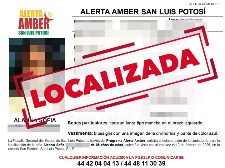 La Fiscalía General del Estado de San Luis Potosí (FGESLP) informa la localización de Alanna Sofia, quien era buscada desde el 12 de febrero de 2025 en la capital de la entidad.