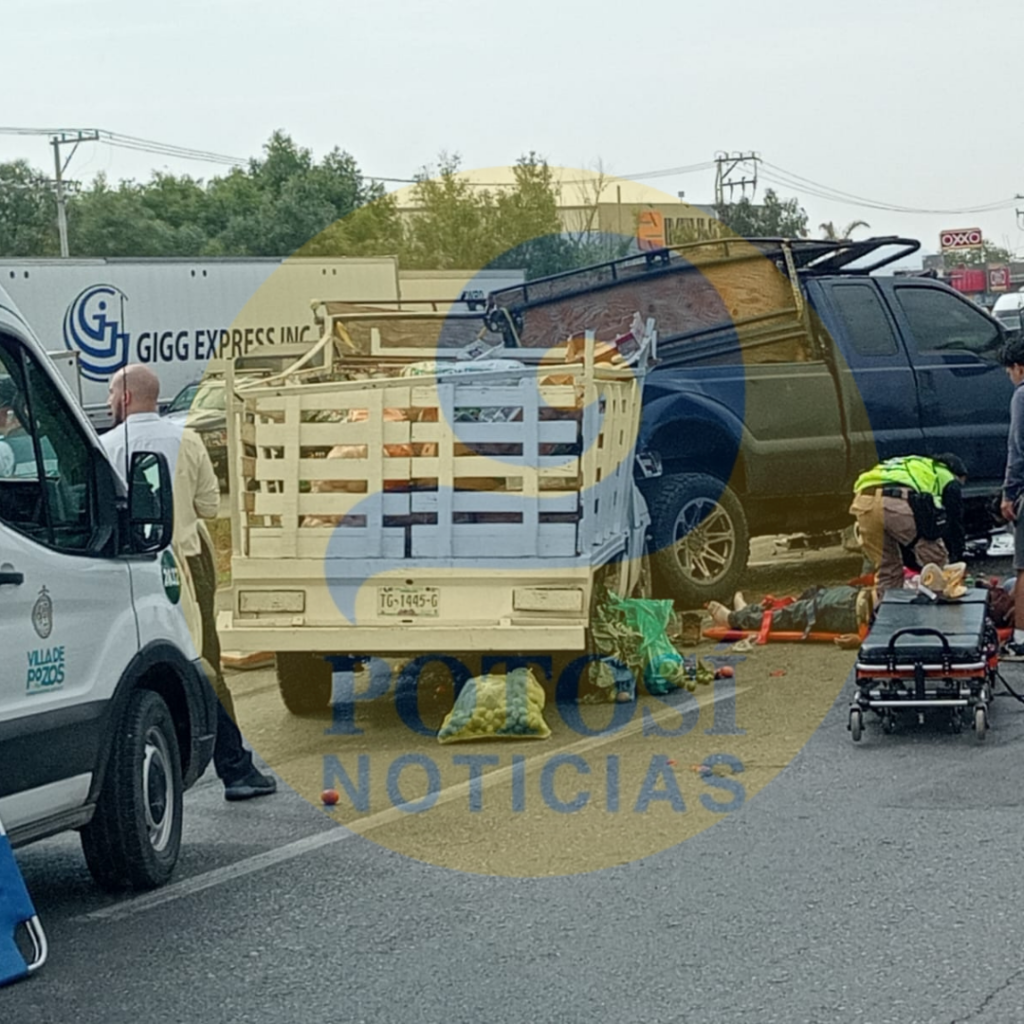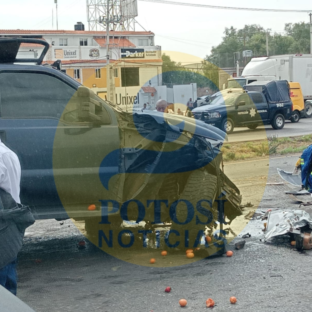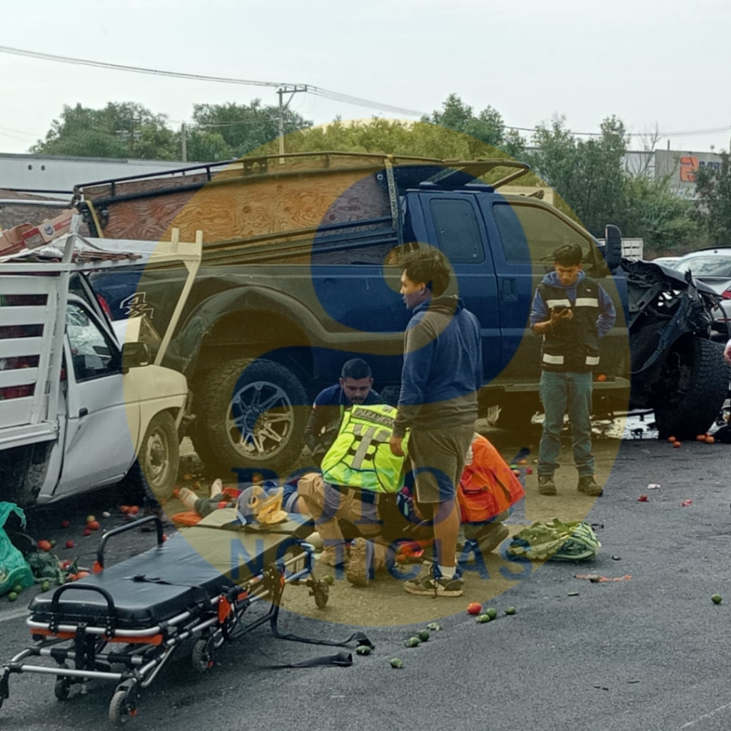 Sobre la carpeta asfáltica dos camionetas, una pickup azul y una tipo estacas color blanca se impactaron ocasionándose severos destrozos mientras que abajo de la carretera se encontraba un auto blanco totalmente destrozado.