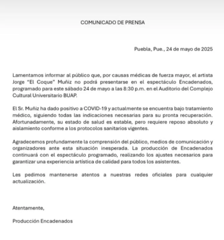 “Y tómala, con la novedad de que me dio Covid y hasta el hospital fuimos a parar. Estaremos un día más, pero ya en terapia media. No pudimos estar con mis amigos de Puebla ayer. Gracias por su comprensión, prometo regresar muy pronto. Una sincera disculpa. ¡Coqueman está de regreso!”, afirmó el cantante en sus redes sociales.