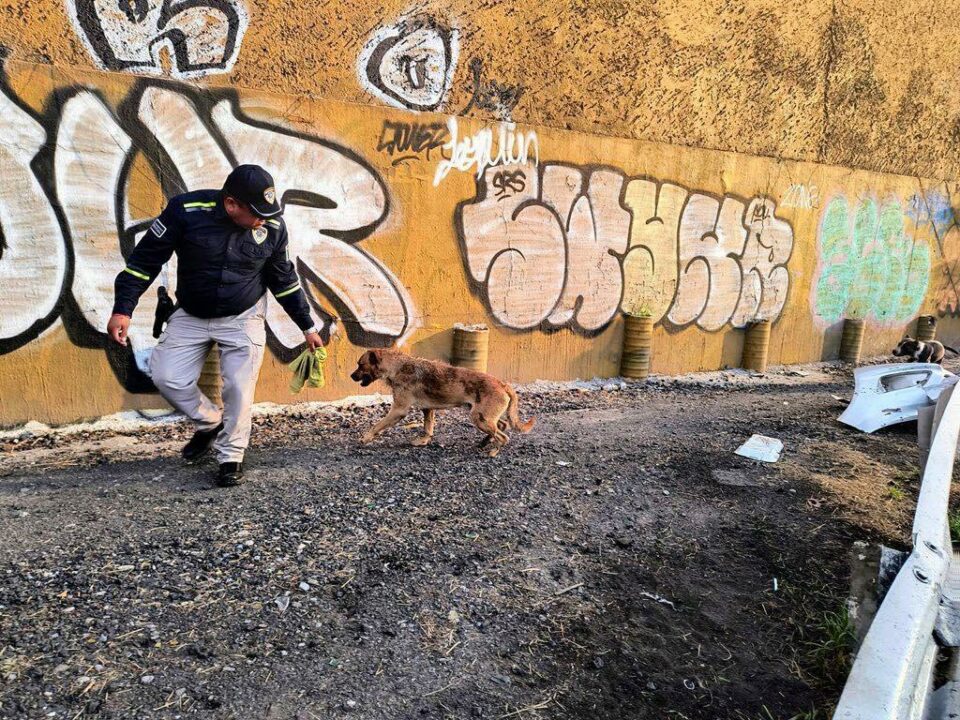 Agente de la Policía Vial de la Secretaría de Seguridad y Protección Ciudadana Municipal auxiliaron un can severamente lastimado, que fue localizado sobre la Avenida Muñoz a la altura de la curva hacia Capitán Caldera, una zona de alto tráfico vehicular, donde corría el riesgo de ser atropellado.