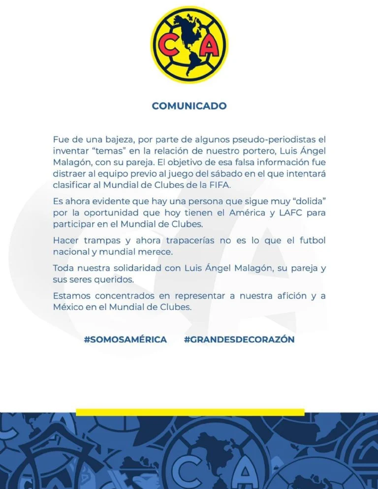 Ademas, aseguraron que el objetivo de la Fake News en la que involucraron a Luis Ángel Malagón fue para “distraer al equipo previo al juego del sábado”. Este 31 de mayo, el América se disputará en la cancha el pase al Mundial de Clubes con Los Ángeles FC.
