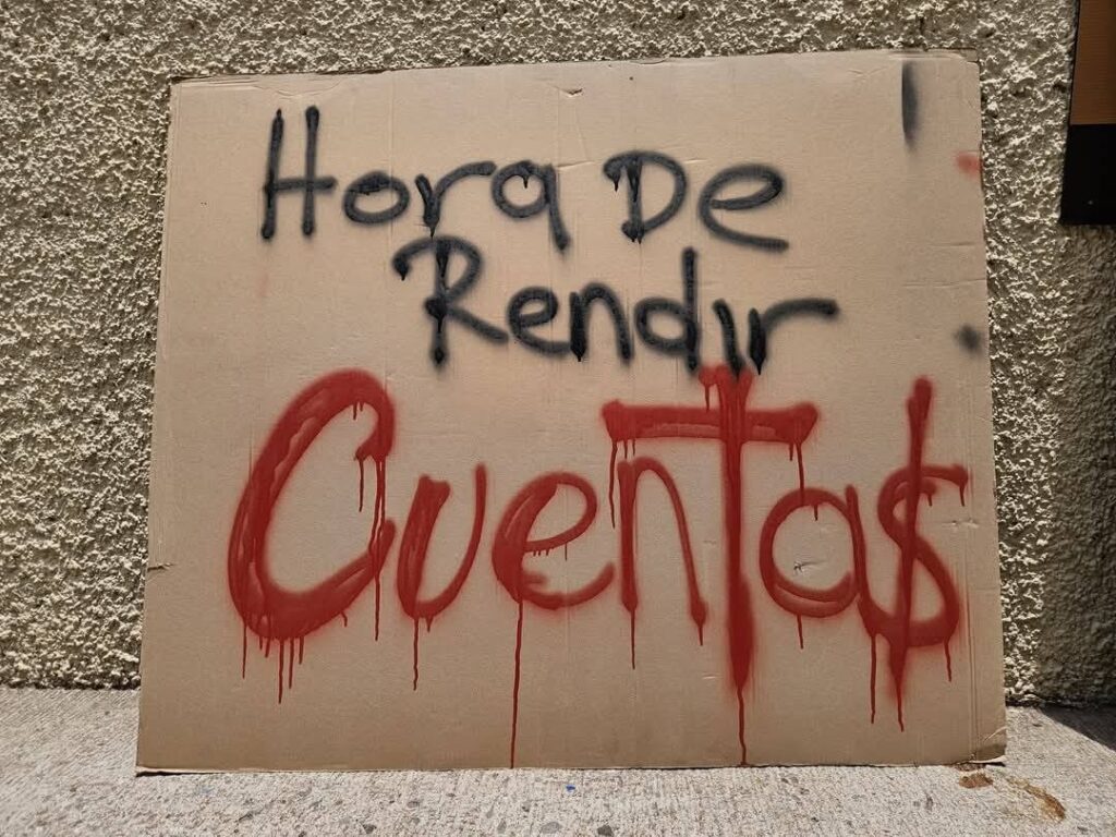 En el suelo y sobre la fachada de los edificios, se ven cartones del tamaño de cartulinas con las siguientes leyendas: “Nunca arreglaste talleres”, “Nunca regreses”, “La Dirección te quedo grande”, “No te bastaron 5 años”, “Feliz Jubilación”, “Ya pasaste a los baños Rosa”, evidenciando el deterioro de las instalaciones.