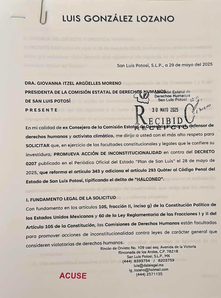 Este viernes, al medio día el ex Consejero de la CEDH, defensor de derechos humanos y activista climático, entregó un oficio a la CEDH para solicitar que, en ejercicio de las facultades constitucionales y legales, promueva una acción de inconstitucionalidad en contra del Decreto