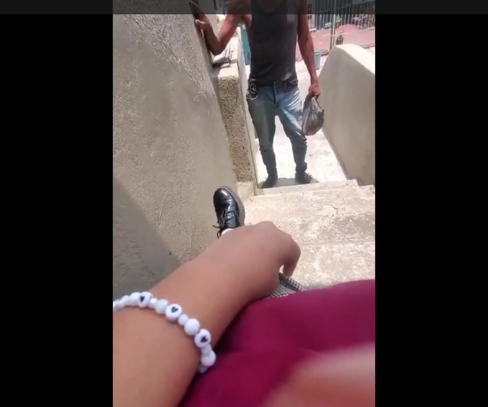 a escena se desarrolla en las escaleras que dan acceso al domicilio de la estudiante, que viste el uniforme y tiene su mochila. La menor trata de cubrir sus piernas, ya que el tipo -por momentos- parece que tiene intensiones de subir donde yace sentada esperando a su familia.