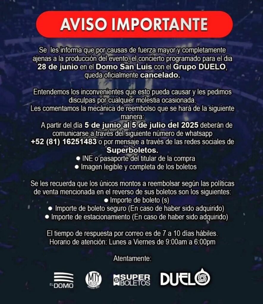 El Domo envió el siguiente comunicado: “Aviso importante se les informa que por causas de fuerza mayor y completamente ajenas a la producción del evento, el concierto programado para el día 28 de junio en el Domo San Luis con el grupo Duelo queda oficialmente cancelado.