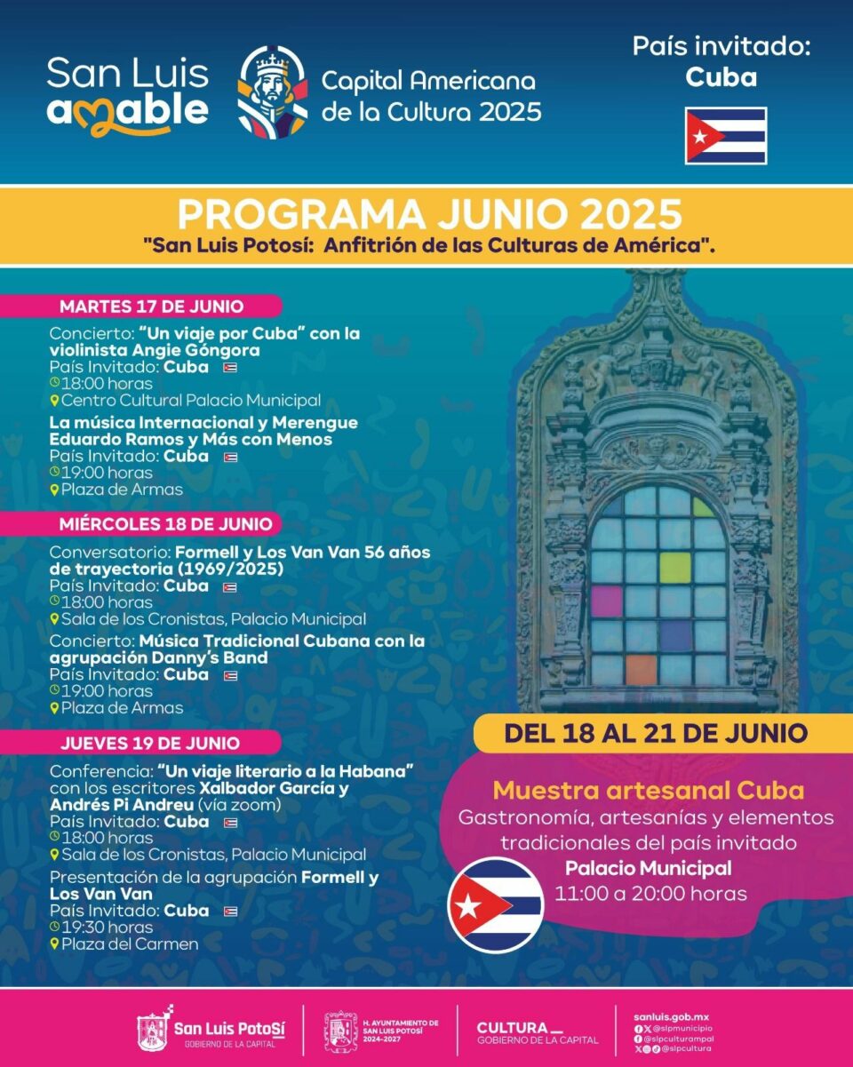 El Gobierno de la Capital alista el programa cultural en el que San Luis Potosí, Capital Americana de la Cultura 2025, recibe arte y cultura de Cuba, por lo que del 18 al 21 de junio se instala en el Centro Cultural Palacio Municipal una muestra artesanal de estos dos países hermanos.