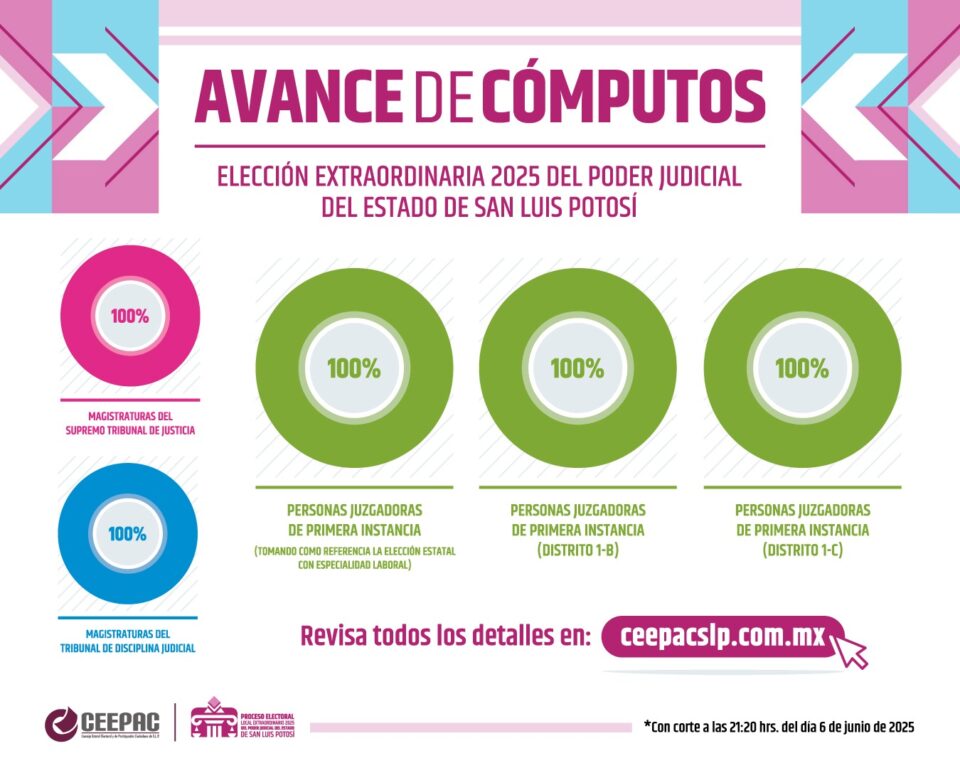 Tras 5 días de cómputos los 58 comités municipales en San Luis Potosí, concluyeron los cómputos de la elección del Poder Judicial, el Consejo General del Consejo Estatal Electoral y de Participación Ciudadana (CEEPAC) concluyó la noche del viernes, la sesión permanente de seguimiento a los cómputos municipales, la cual inició el domingo 1 de junio posterior al cierre de la sesión permanente de seguimiento a la jornada electoral.