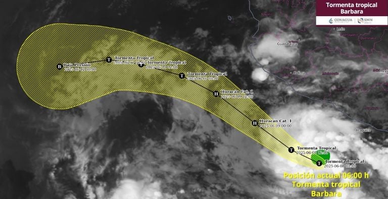 El Servicio Meteorológico Nacional (SMN) anunció la formación de la tormenta tropical Bárbara en el océano Pacífico. A las 06:15 horas de este domingo, se localizaba a 280 kilómetros al sur-suroeste de Zihuatanejo, Guerrero, con vientos sostenidos de 75 kilómetros por hora y ráfagas que alcanzan hasta los 95 km/h.