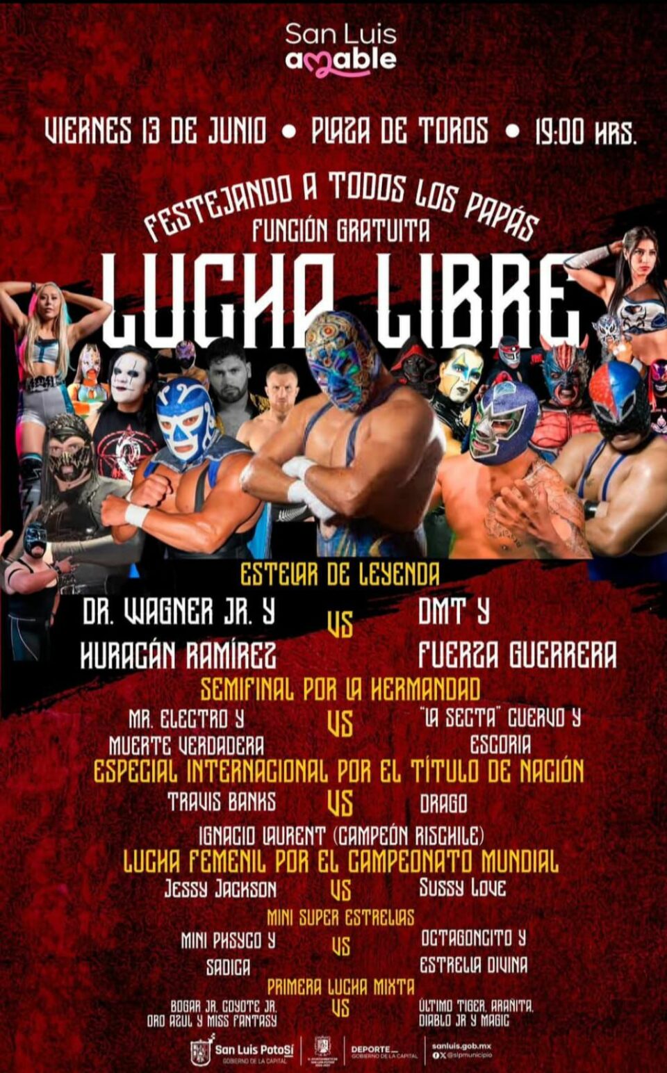 La Dirección de Deporte Municipal del Gobierno de la Capital está lista para la gran función de lucha libre profesional, en la que verán acción los mejores exponentes de la baraja nacional, este viernes 13 de junio. Este evento gratuito que habrá de dar inicio a las 19:00 horas, será para todos los aficionados potosinos que deseen asistir.