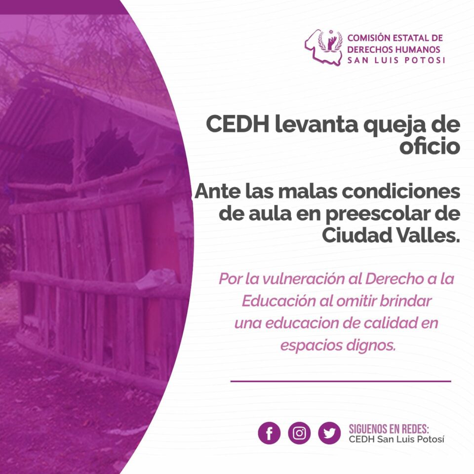 Ante las malas condiciones en las que prevalece un aula del centro educativo preescolar “Benito Juárez”, ubicado en la comunidad de Tanculpaya, perteneciente al municipio de Ciudad Valles, la Comisión Estatal de Derechos Humanos (CEDH) informó que, a través de la Segunda Visitaduría, se levantó una queja de oficio contra la Secretaría de Educación de Gobierno del Estado (SEGE), ante la vulneración de derechos humanos de niñas y niños que acuden a recibir educación en este plantel.