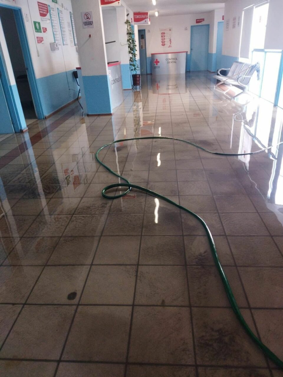 En las imágenes, se observa el piso lleno de agua y mucha tierra, así como trabajadores tratando de quitar el exceso de líquido con mangueras y una bomba de agua de los pasillos de la institución sanitaria.