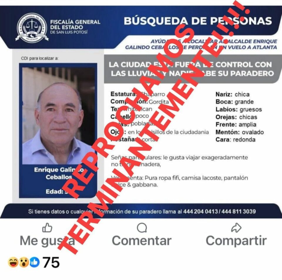 En un contexto donde la crisis de desapariciones en México ha dejado una herida abierta en miles de familias, la aparición de una imagen paródica que simula una ficha de búsqueda —esta vez, con el rostro del presidente municipal de San Luis Potosí— ha desatado una controversia.