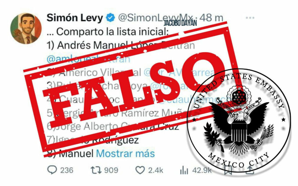 “Esta información es falsa”, publicó la representación diplomática desde su cuenta oficial en respuesta al listado difundido por el exsubsecretario de Turismo, Simón Levy, quien horas antes anunció que revelaría los nombres de “políticos, gobernadores y personas políticamente expuestas mexicanas” con supuestas órdenes de aprehensión en Estados Unidos.