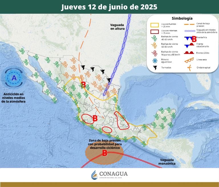 Donde se prevé que este jueves 12 de junio, un canal de baja presión, una vaguada en altura y otros sistemas, ocasionarán lluvias en: