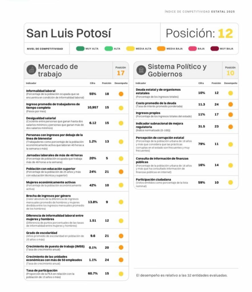 El Estado de San Luis Potosí logró un avance significativo en el Índice de Competitividad Estatal 2025 al subir seis posiciones respecto del año pasado y ubicarse en el lugar 12, además está en un nivel de media alta de acuerdo con el reporte del Instituto Mexicano de Competitividad (IMCO).